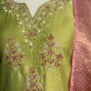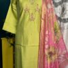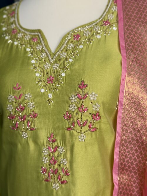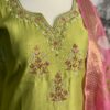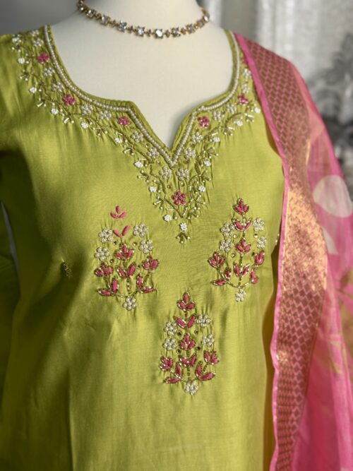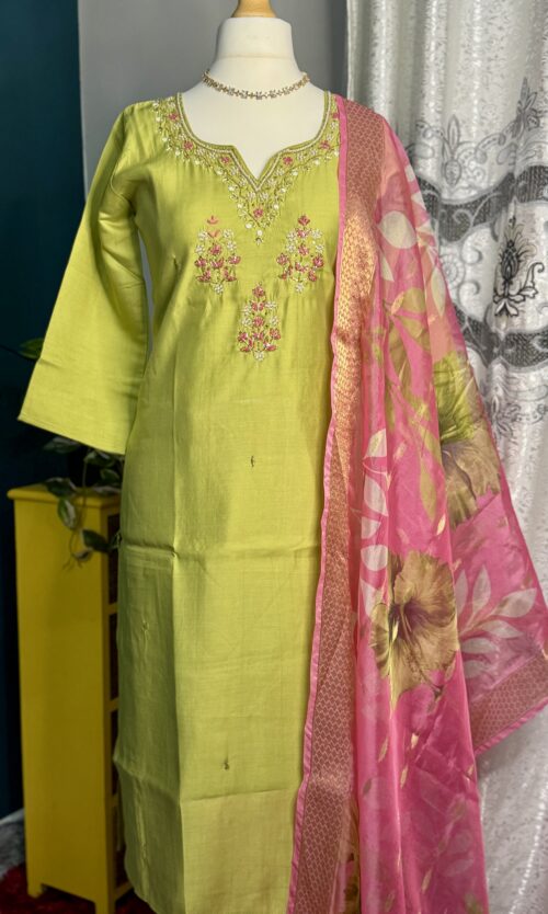 this beautifully crafted lime green kurta, featuring delicate hand embroidery on the neckline and yoke in soft pink and white tones. Paired with a stunning pink floral printed dupatta with a rich border And pink straight bottom 💖