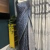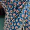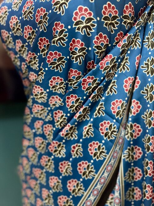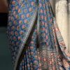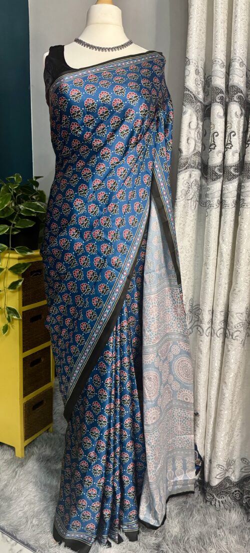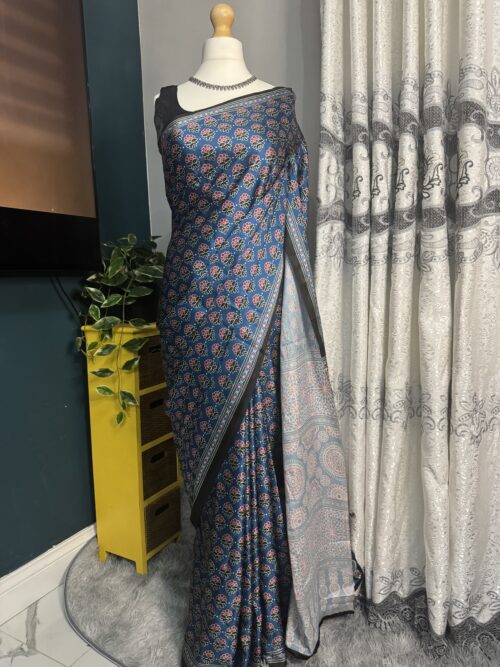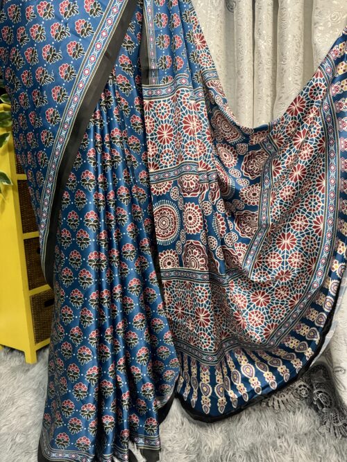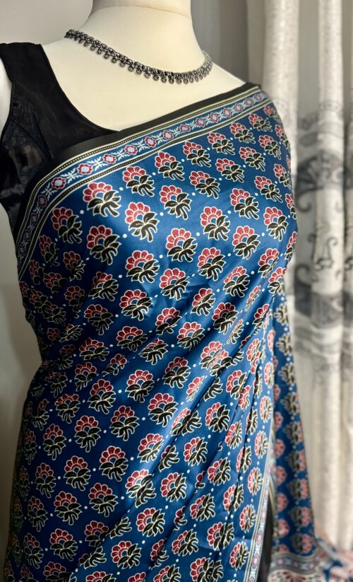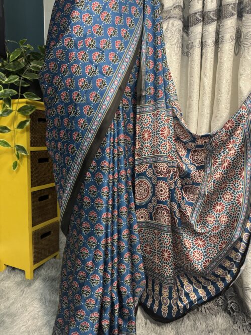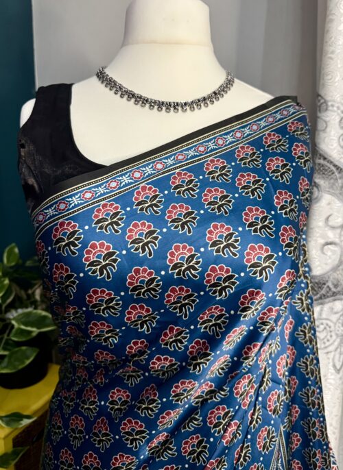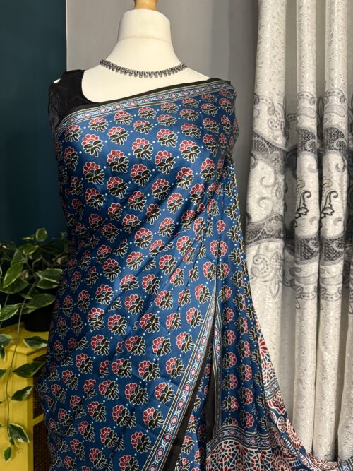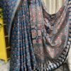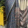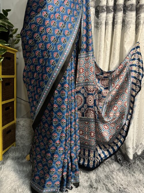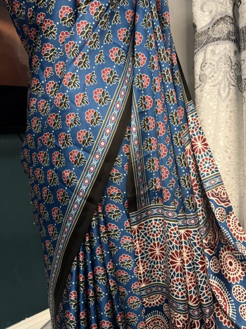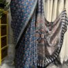 A stunning Semi-Modal saree showcasing Ajrakh digital prints in a Blue and Black color.