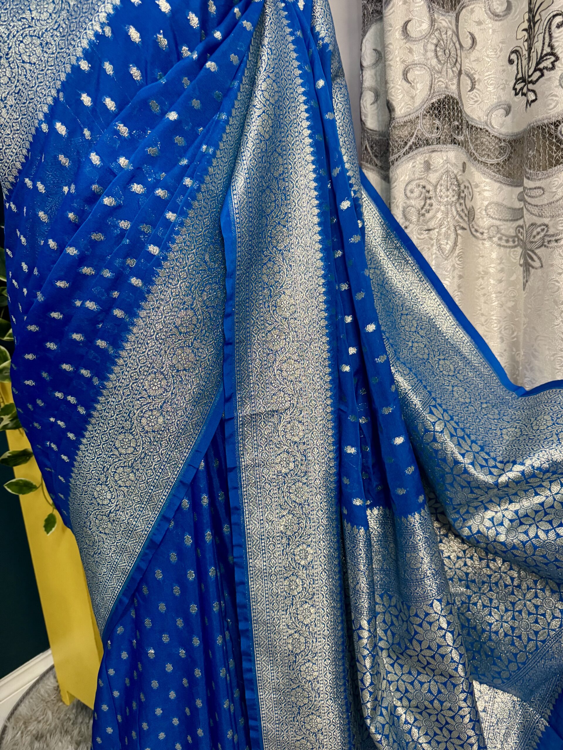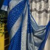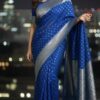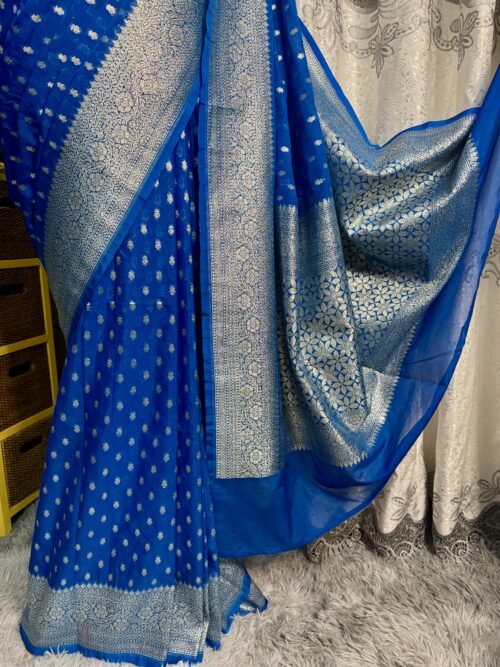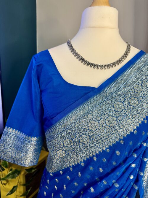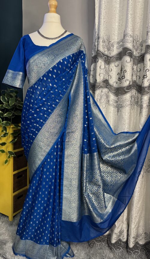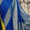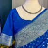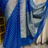 Drape yourself in ย this stunning Bright Royal Blue Banarasi Katan Georgette Saree, beautifully woven with intricate gold zari motifs and a grand traditional border.