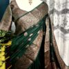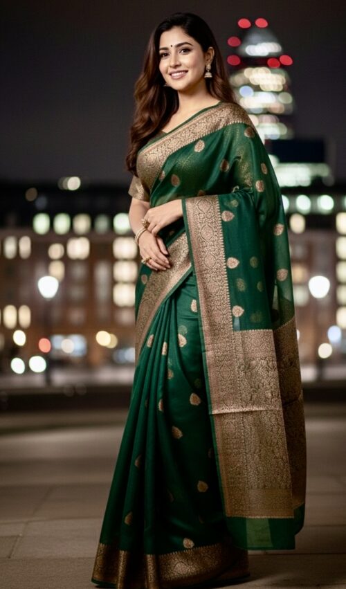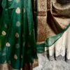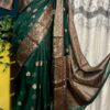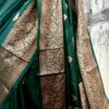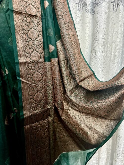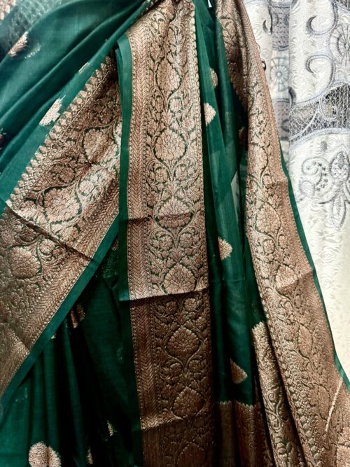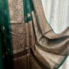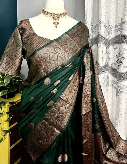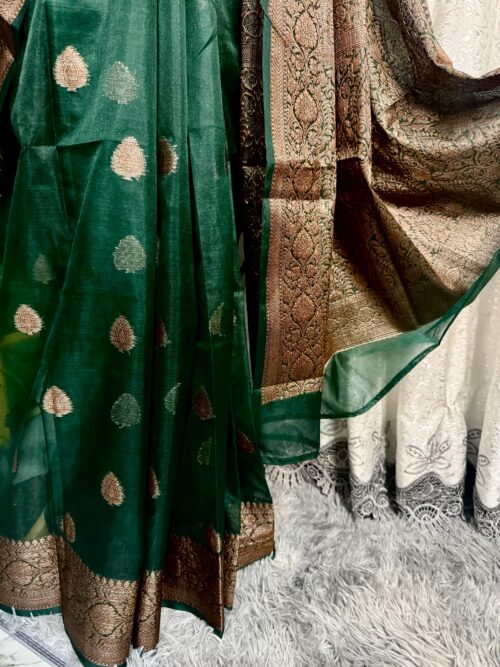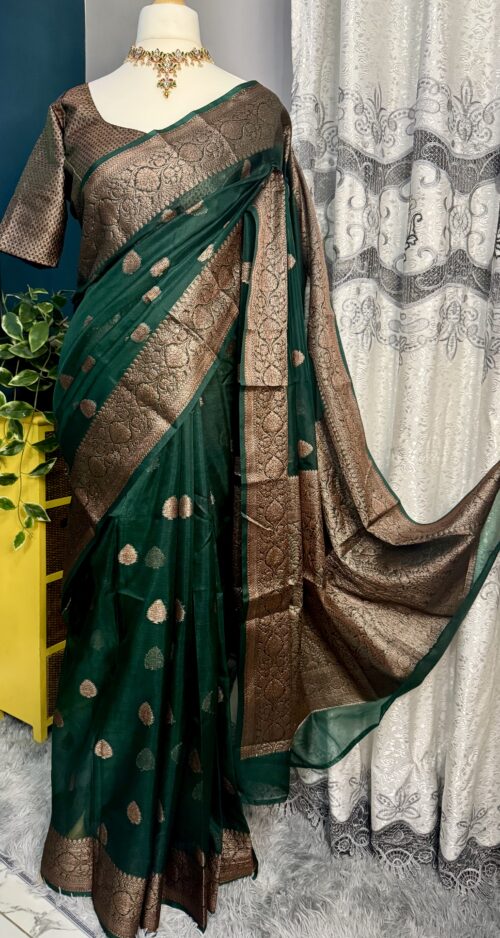 Drape yourself in  this stunning Bottle Green Banarasi  Organza Saree, beautifully woven with intricate copper zari motifs and a grand traditional border.