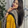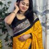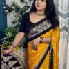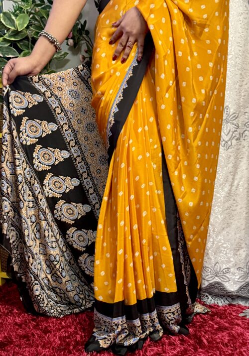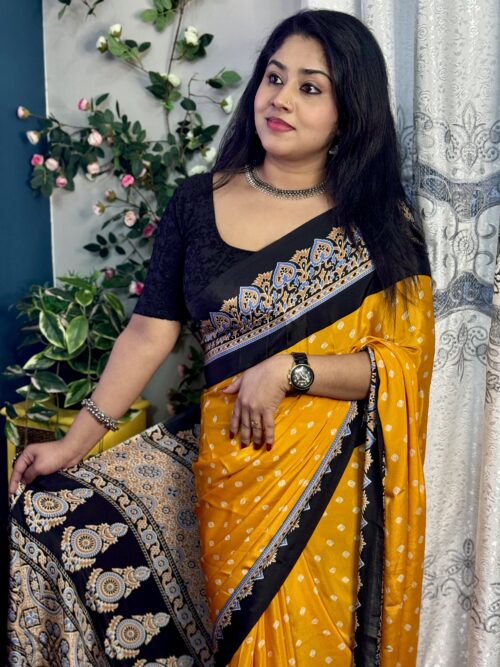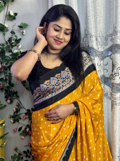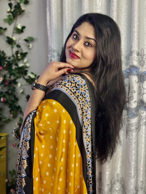 A stunning Semi-Modal saree showcasing bandhini prints in a yellow and ย Black ย color.