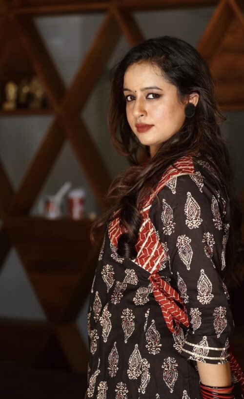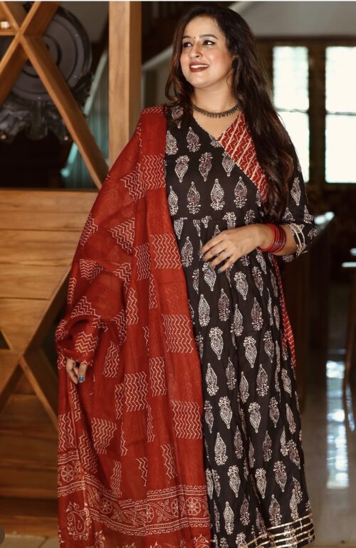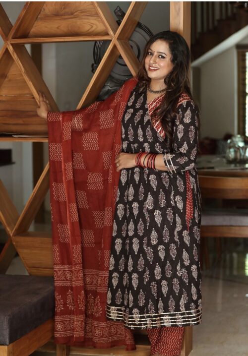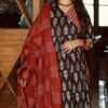 Designer Idaho style umbrella Kurti Pant dupatta set.