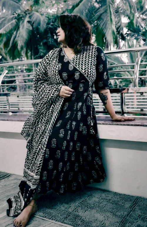 Designer Idaho style umbrella Kurti Pant dupatta set.