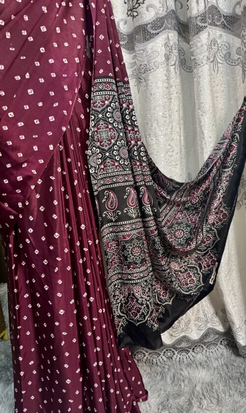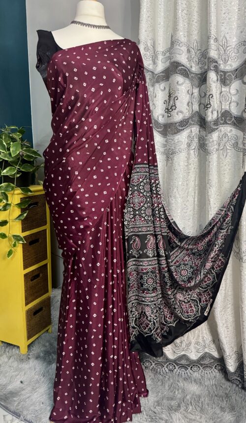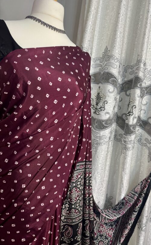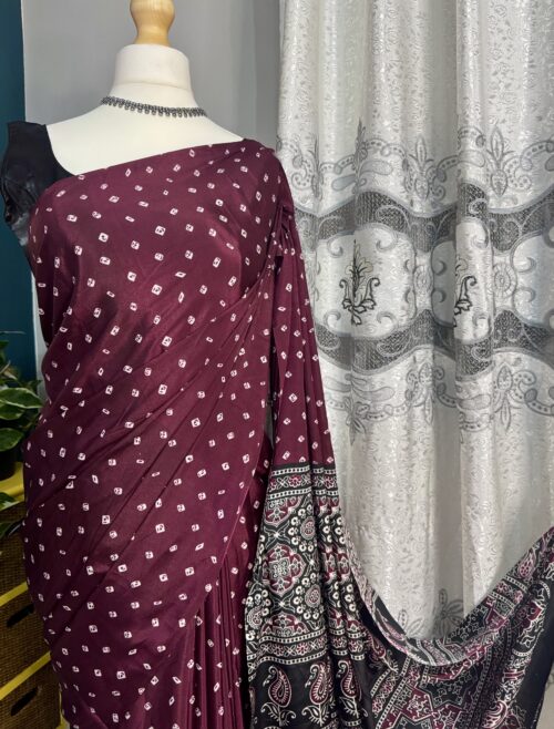 A stunning Semi-Modal saree showcasing bandhini prints in a gravenVine and Black color.