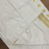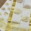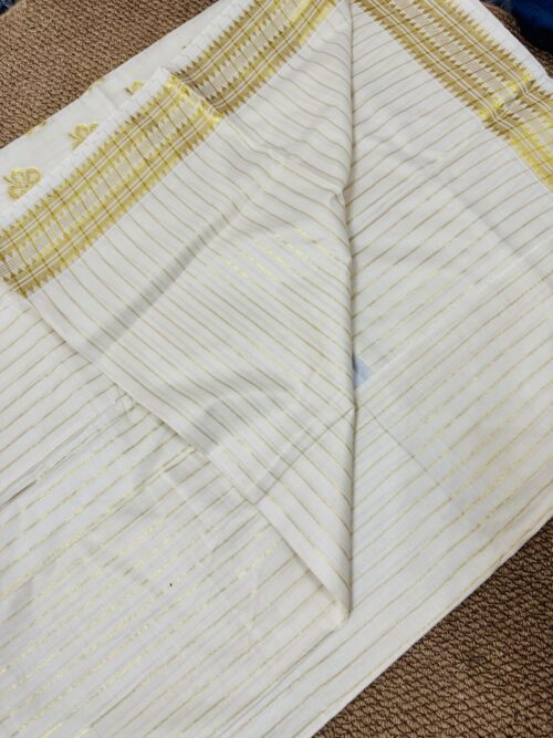 This high-quality handloom saree is crafted from heavy cotton, featuring a stunning, intricately woven munthani. The saree’s body is adorned with elegant golden stripes, with running blouse material.