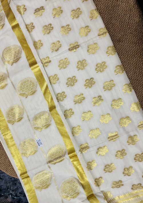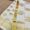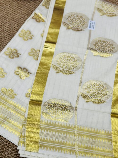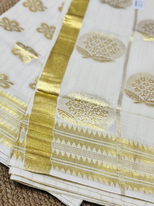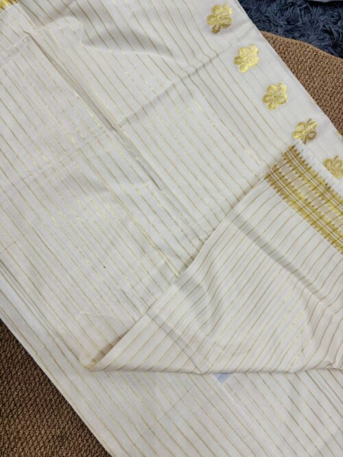 Handloom quality beautifully heavy woven munthani in cotton set saree with golden stripes saree body .