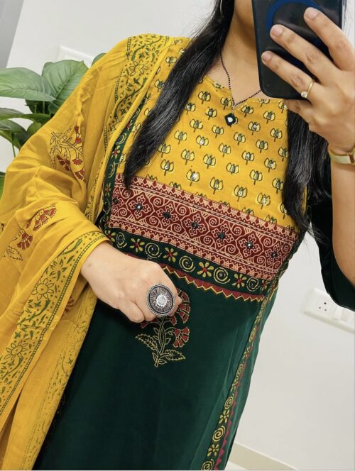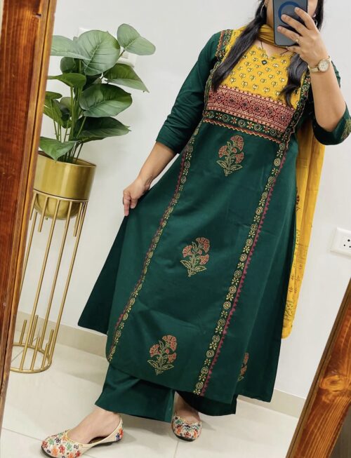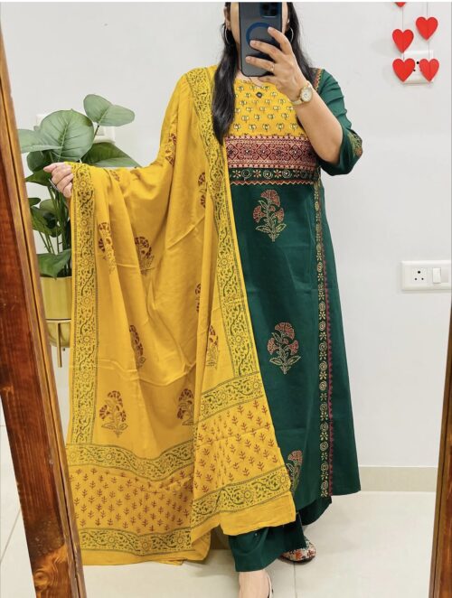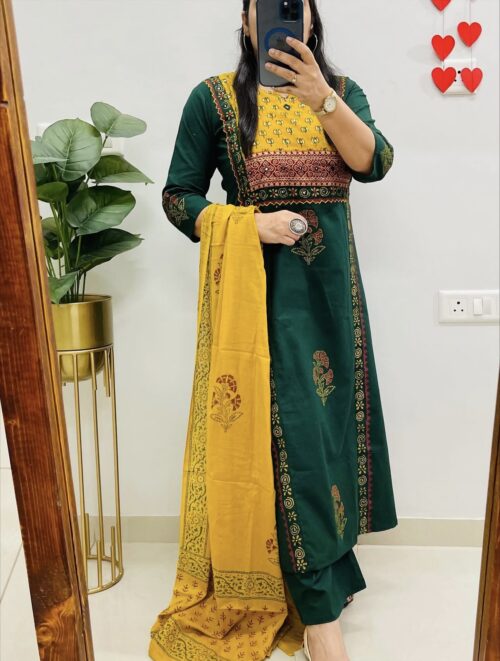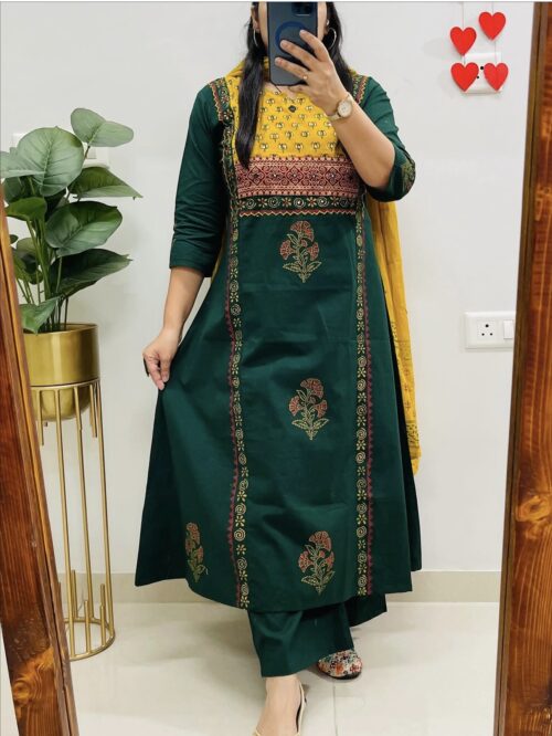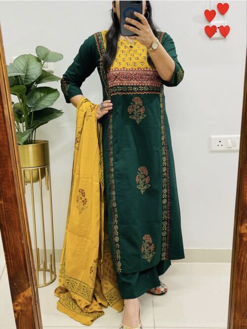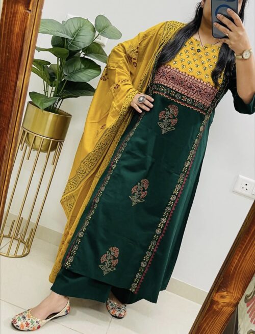 Cotton hand blocked Kurta Set – Bottle Green