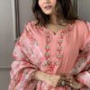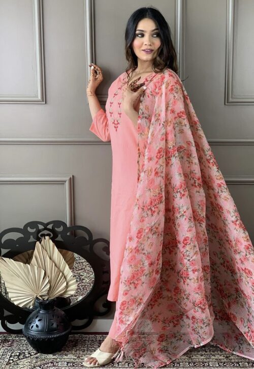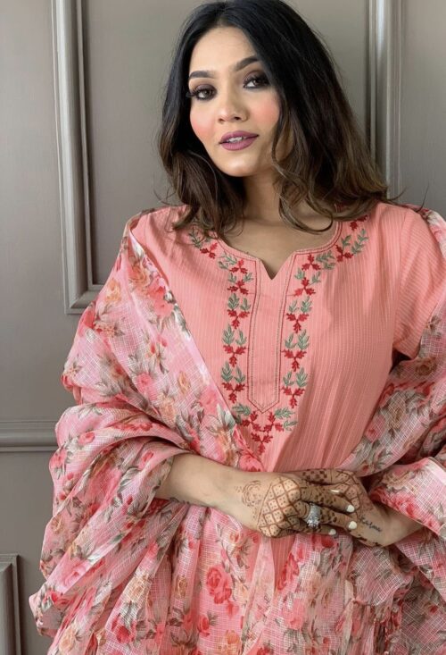 cotton handwoven kurta with embroidery work paired with flower kota doriya dupatta and kantha pants