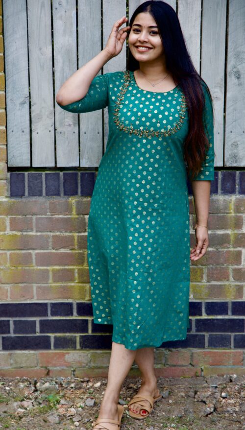 Elevate your style with our stunning cotton kurti, meticulously adorned with intricate handwork. The luxurious blend of soft cotton and shimmering gold foil print creates a captivating look, perfect for any occasion.