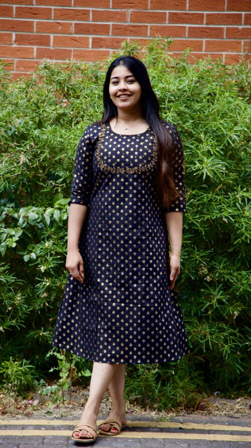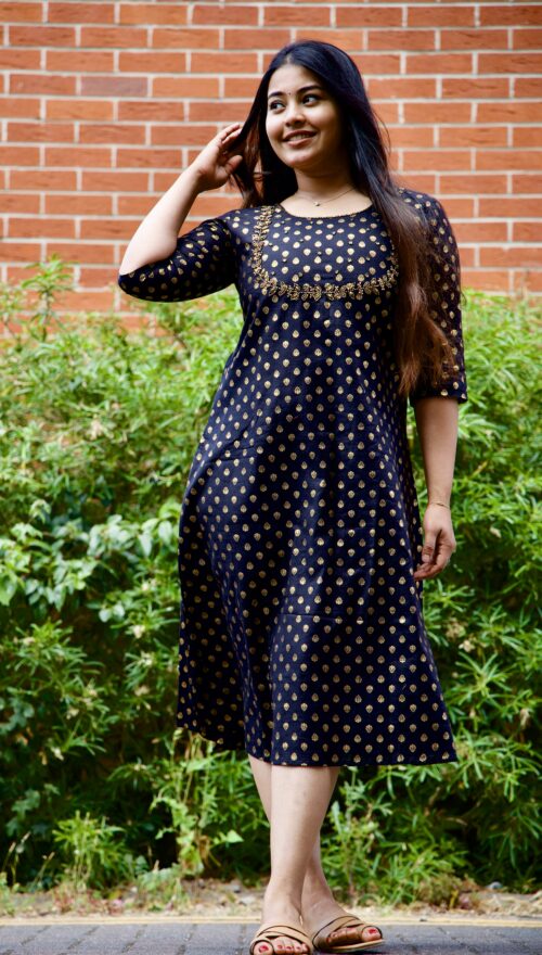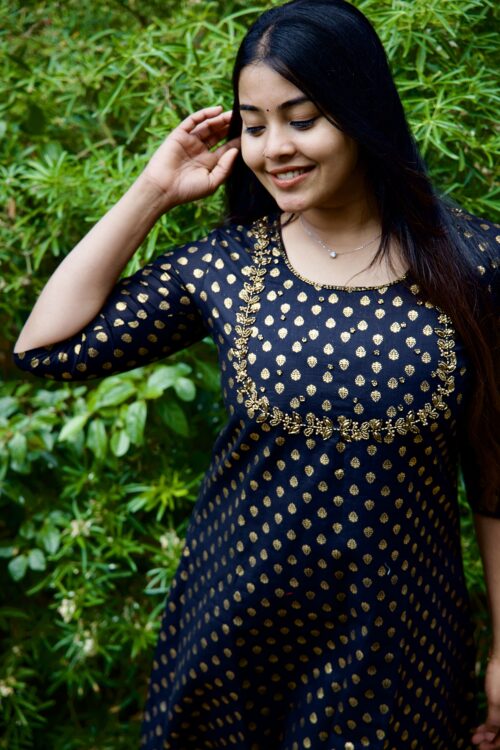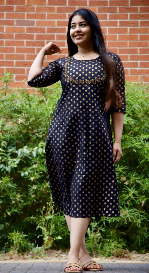 Elevate your style with our stunning cotton kurti, meticulously adorned with intricate handwork. The luxurious blend of soft cotton and shimmering gold foil print creates a captivating look, perfect for any occasion.