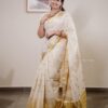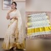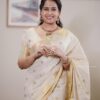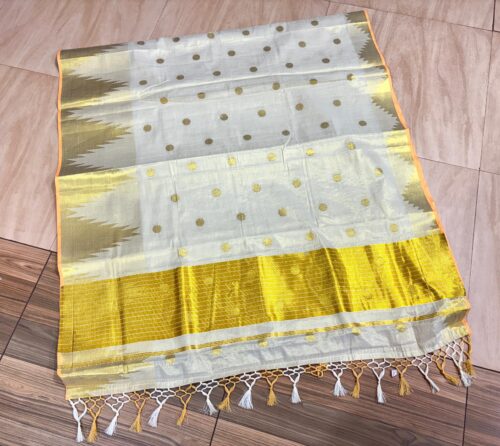 The highlight of the saree is its broad golden zari border and intricately woven Kasavu pallu, finished with traditional temple motifs that add a regal touch. This saree celebrates the richness of Kerala’s weaving heritage, perfect for festive occasions.