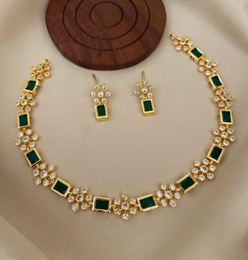 Adorn yourself with elegance in the Gold Finish Flower Design Emerald and AD Stones Necklace.