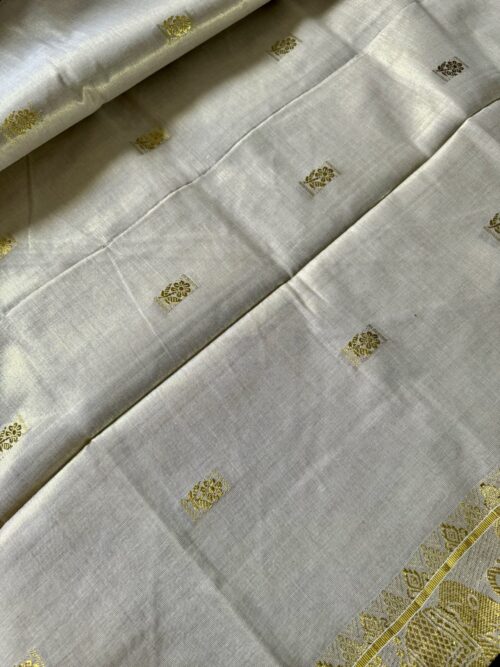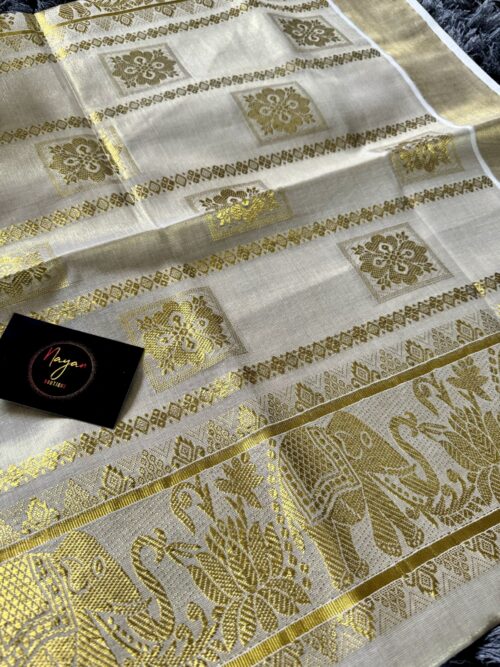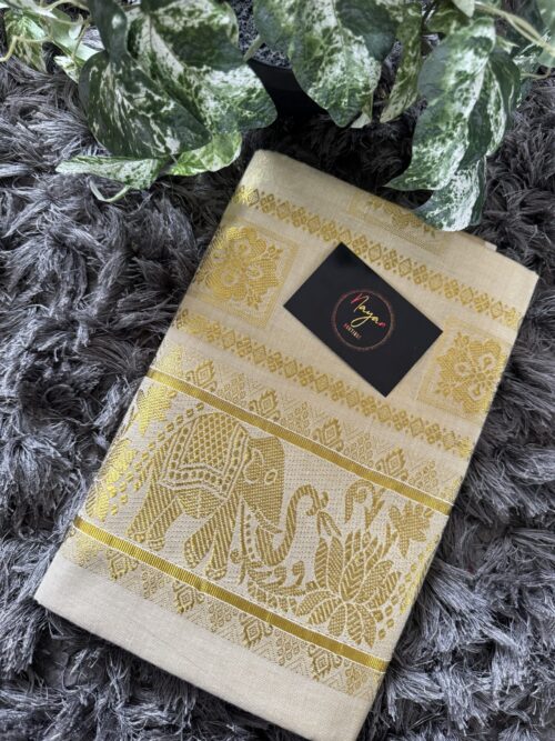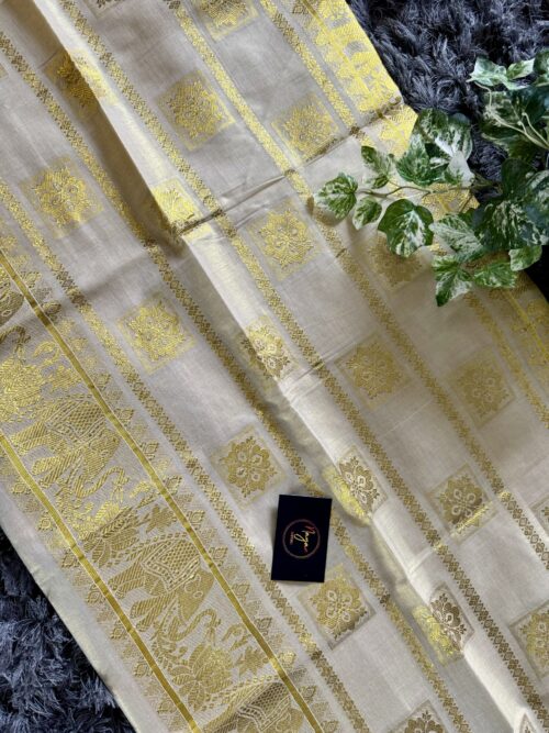 Handloom quality beautifully heavy woven munthani in golden tissue set saree with golden weaves saree body .