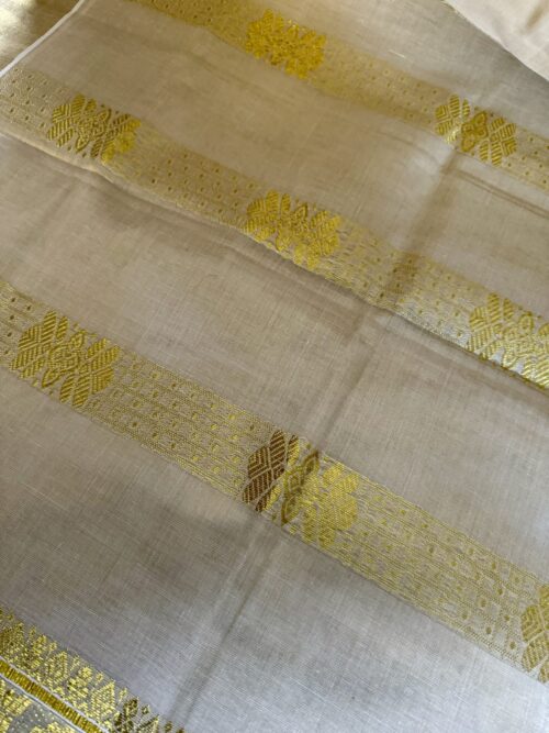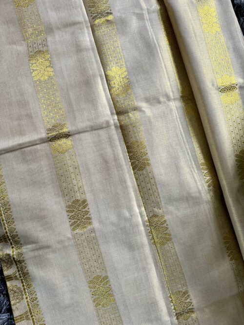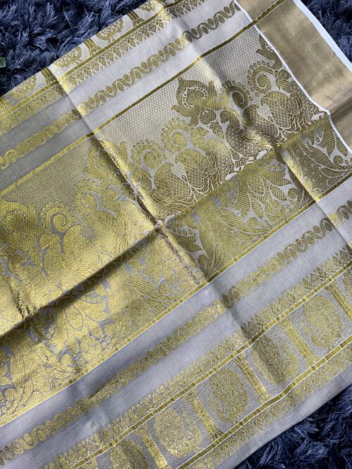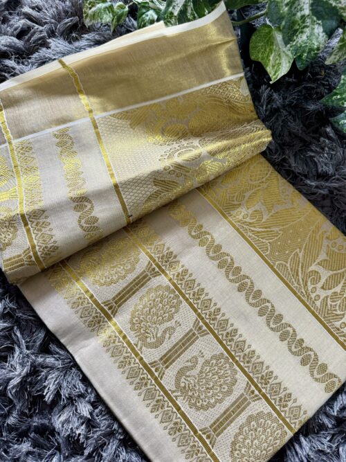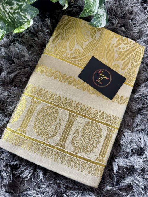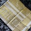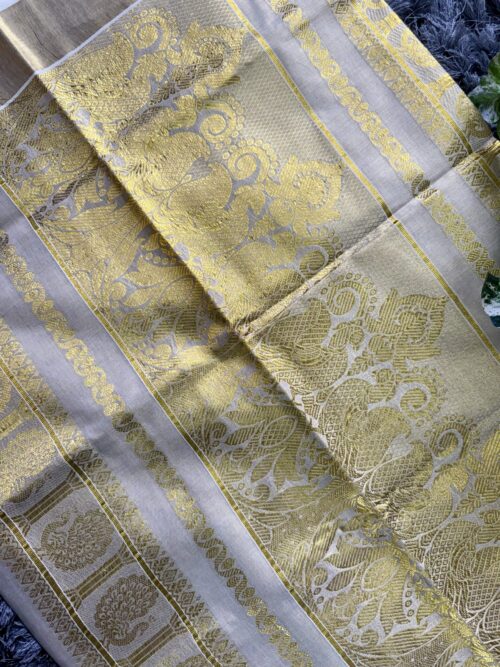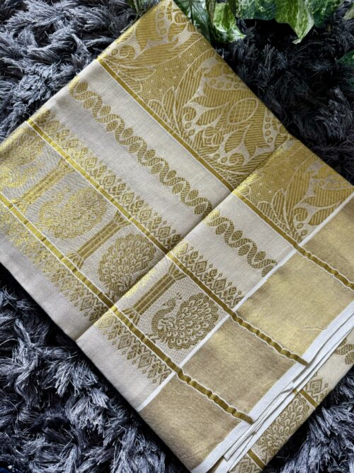 Handloom quality beautifully heavy woven munthani in golden tissue set saree with golden weaves saree body .