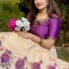 Celebrate in style with our stunning traditional Pattu Pavadai set, beautifully handcrafted for a truly elegant look. This set features intricate handwork on the top, making it a perfect choice for your Onam celebrations.