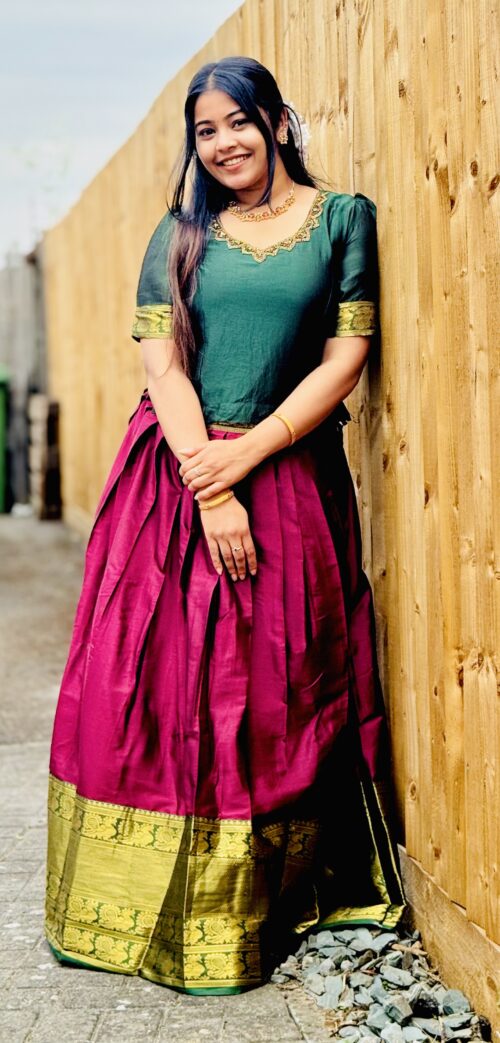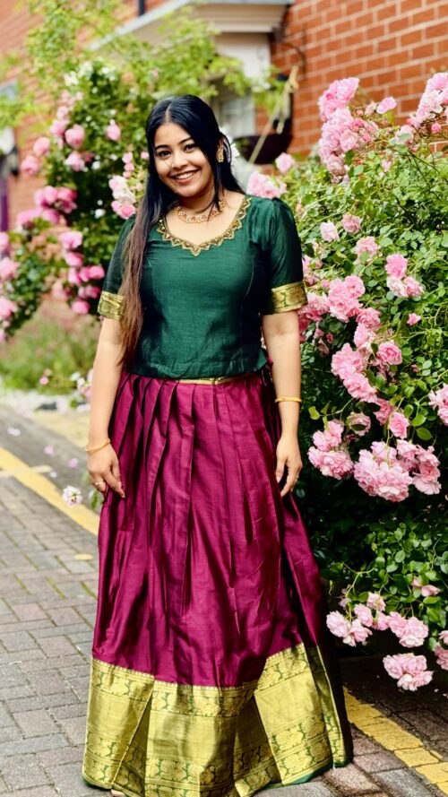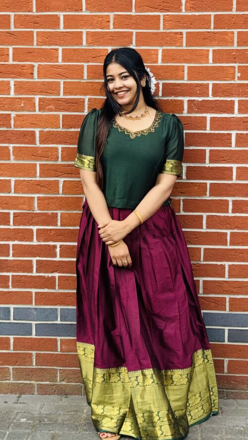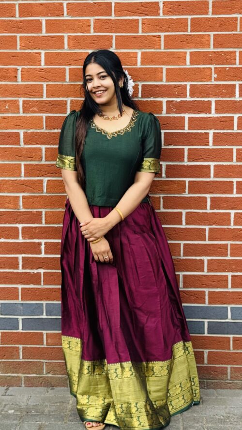 Celebrate in style with our stunning traditional Pattu Pavadai set, beautifully handcrafted for a truly elegant look. This set features intricate handwork on the top, making it a perfect choice for your Onam celebrations.