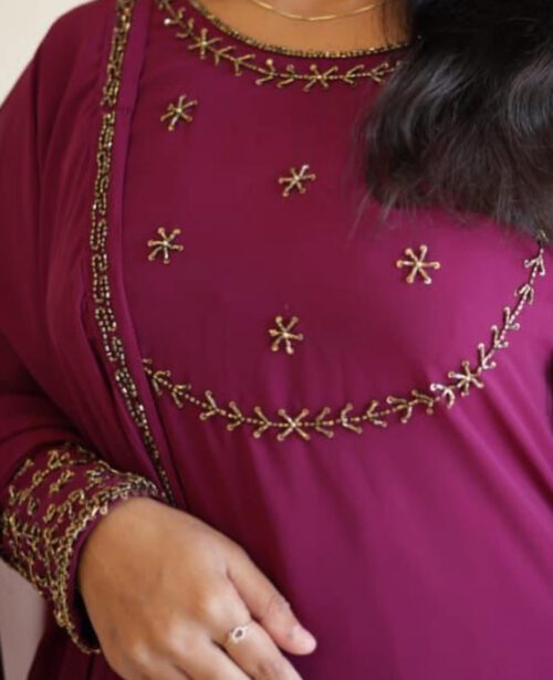 Make a statement in this flowing, Purple 3-piece salwar set. The outfit is defined by exquisite Handwork detailing across the chest and heavily embellished sleeve end. Featuring a long, dramatic hemline (52″ front, 54″ back) and comfortable free-size pants, this luxurious ensemble is ready for any grand occasion.