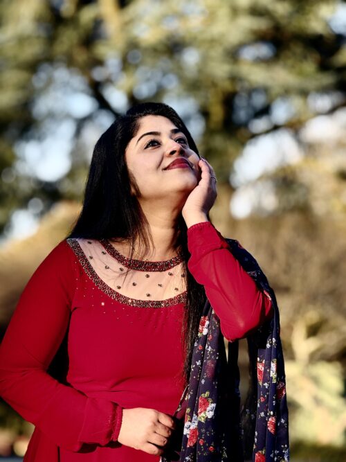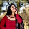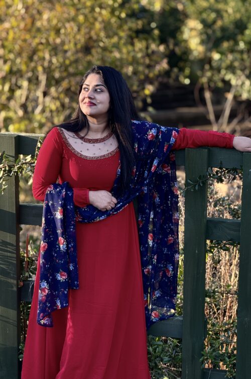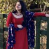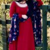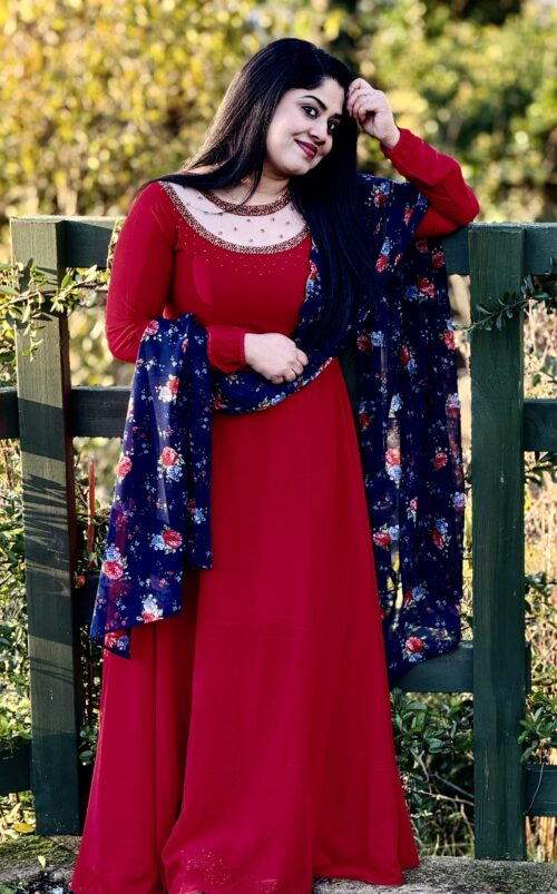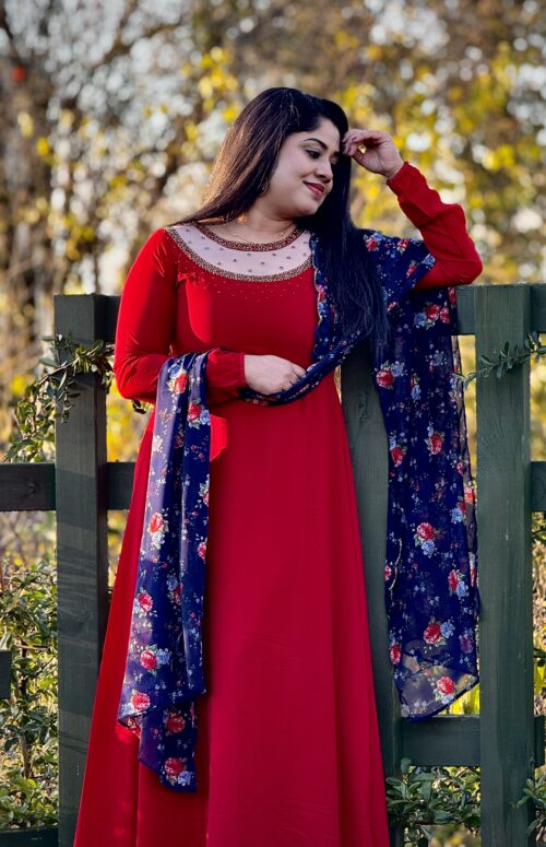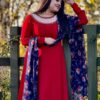 Beautiful Faired Red Jewel Neck Anarkali With Hand-Worked Scalloped Floral Dupatta.