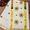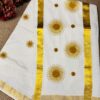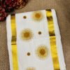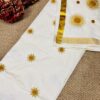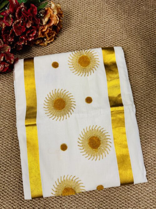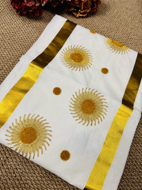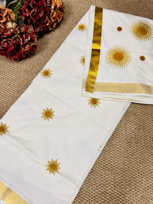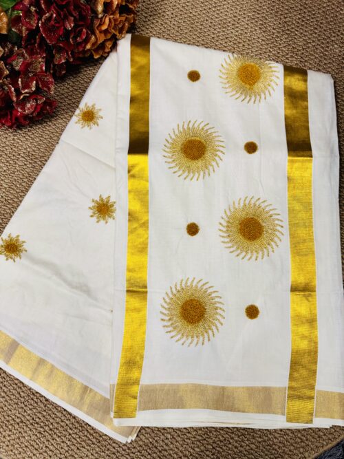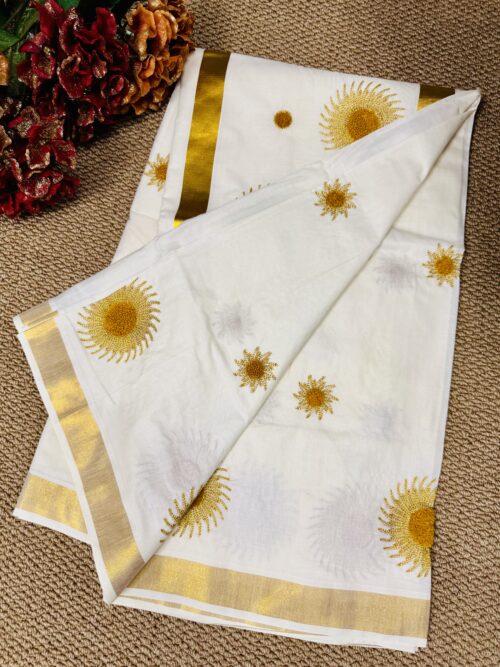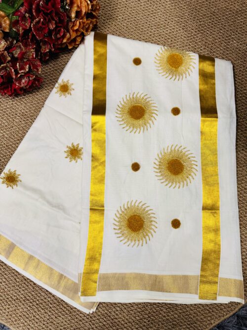 Kerala Set Saree With beautifully adorned Golden Sunburst Embroidery