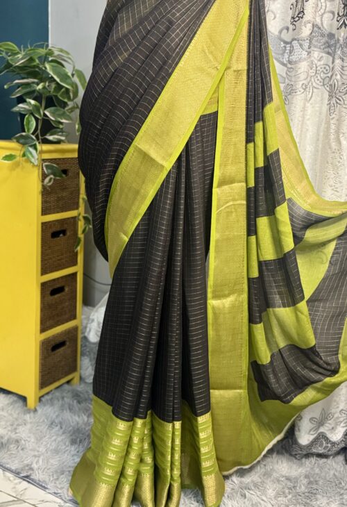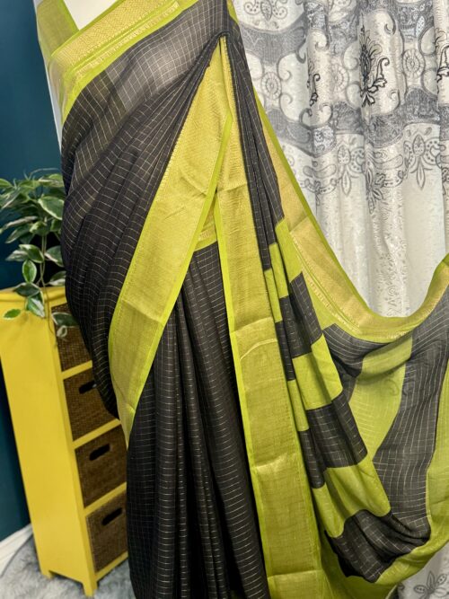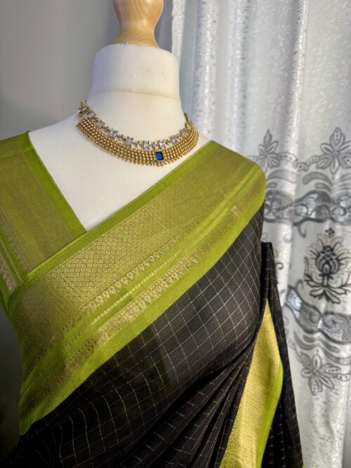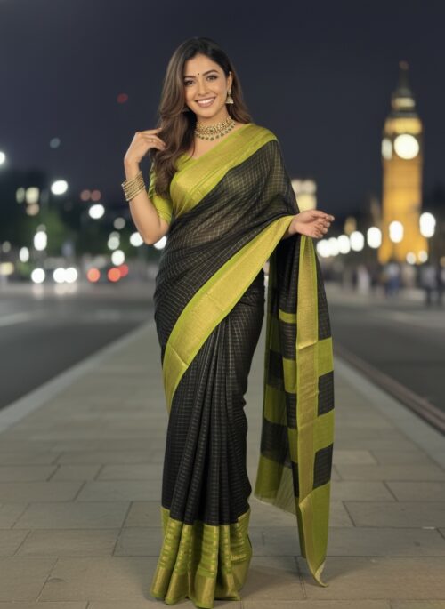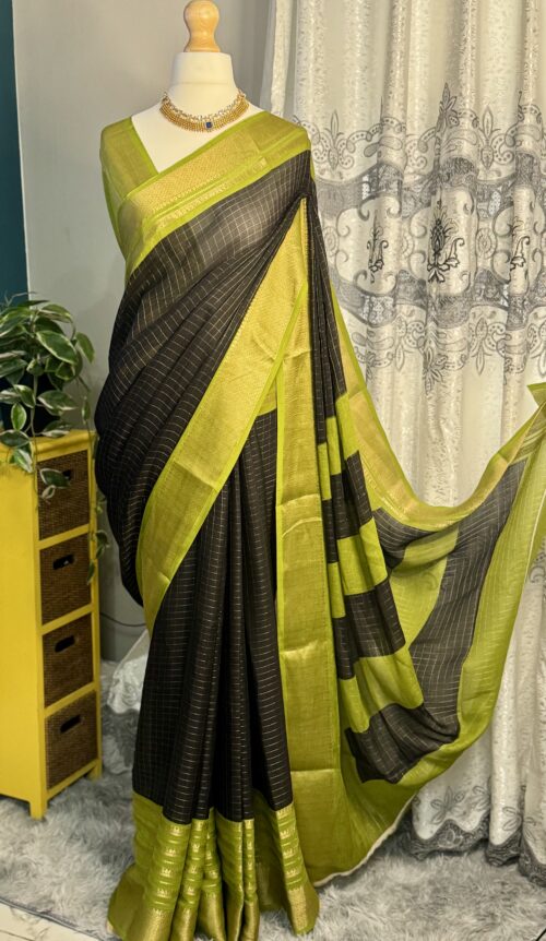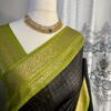 The combination of black and olive green, finished with a classic zari border, makes it perfect
