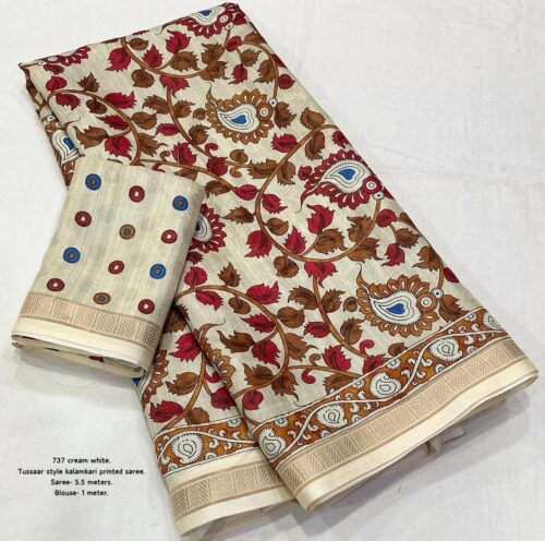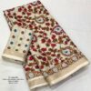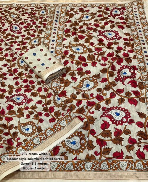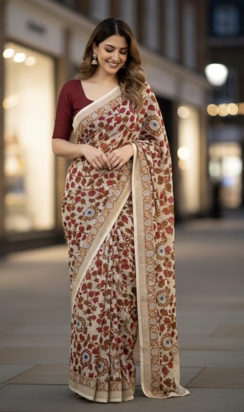 Crafted in breathable Magalagiri cotton, this Kalamkari printed saree features beautiful Kalamkari prints, rich earthy tones, and a classic zari border —