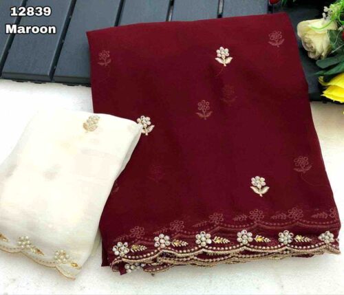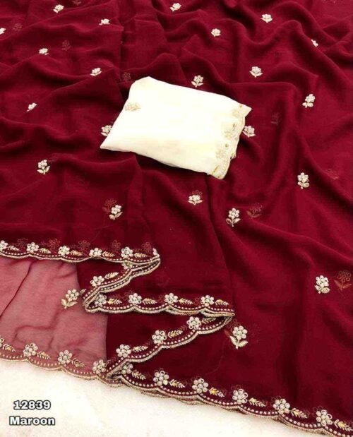 Soft Georgette gold embroidery and scalloped border saree with beautiful floral beads work and stones