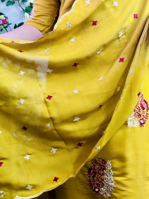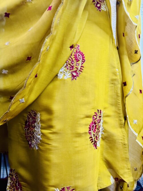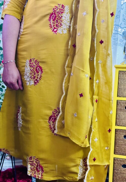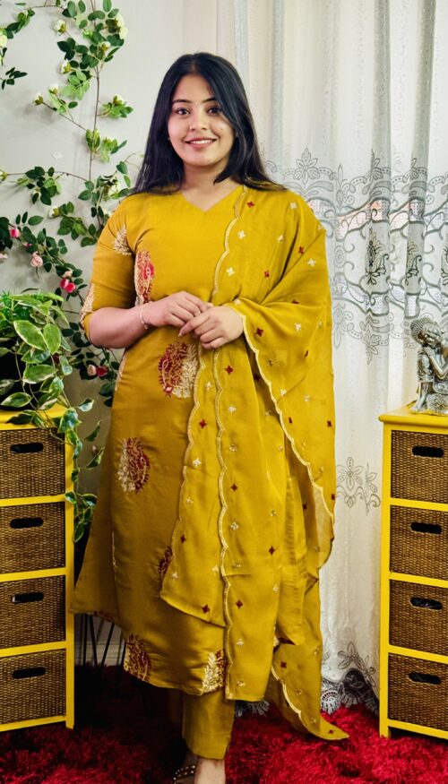 Beautifully crafted Mul Chanderi Salwar Set, flowing silhouette, the kurta and dupatta features exquisite designer floral embroidery that adds a elegant touch