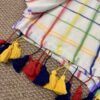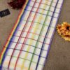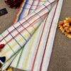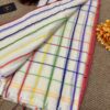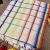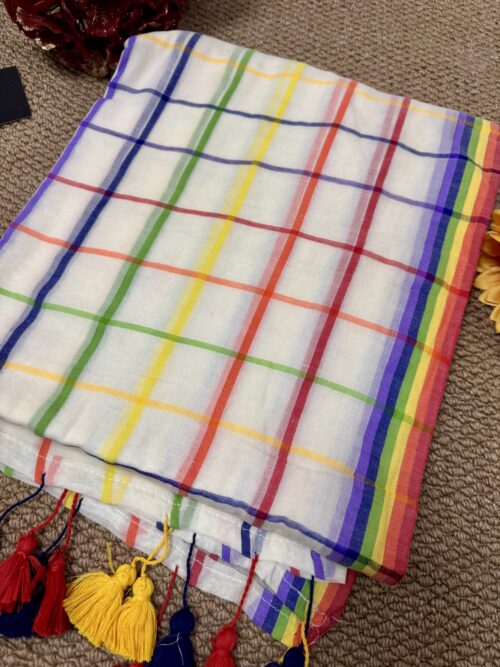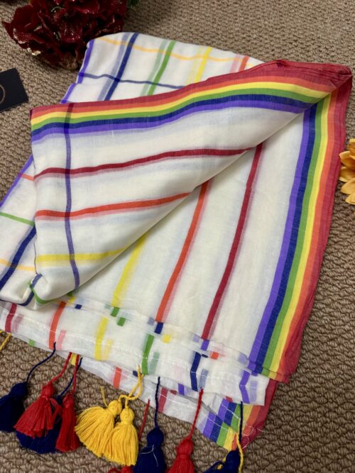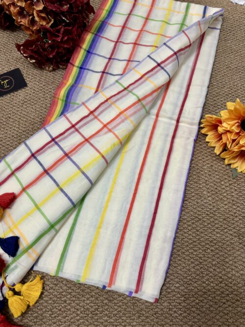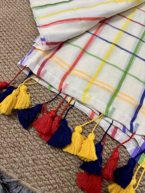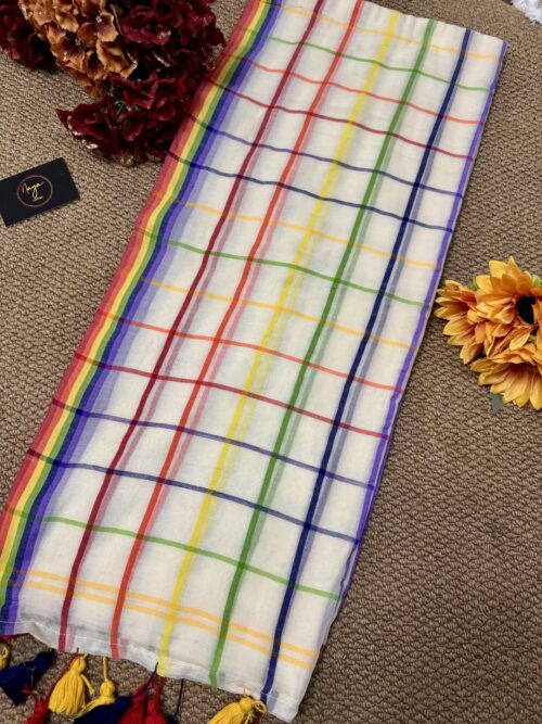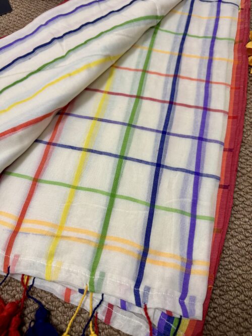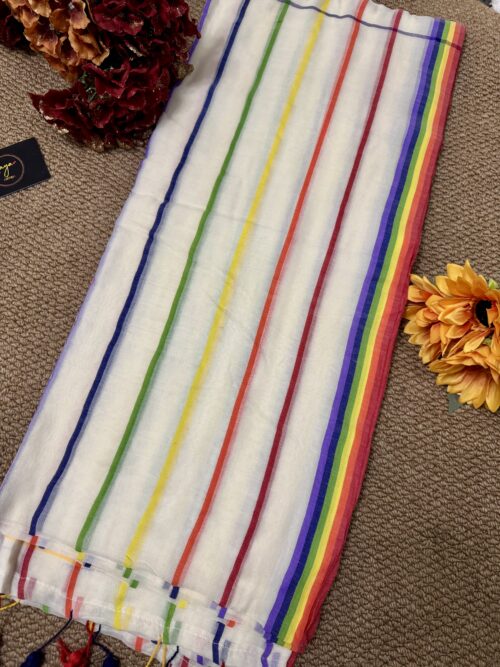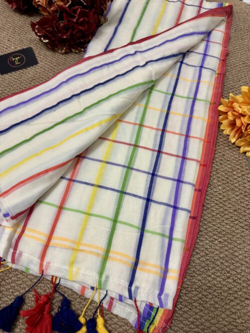 Step into grace with our stunning handwoven Mul Mul saree featuring multicolour border. No blouse included