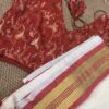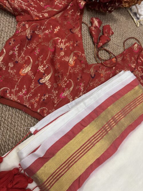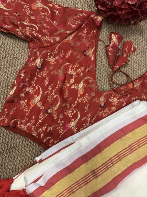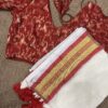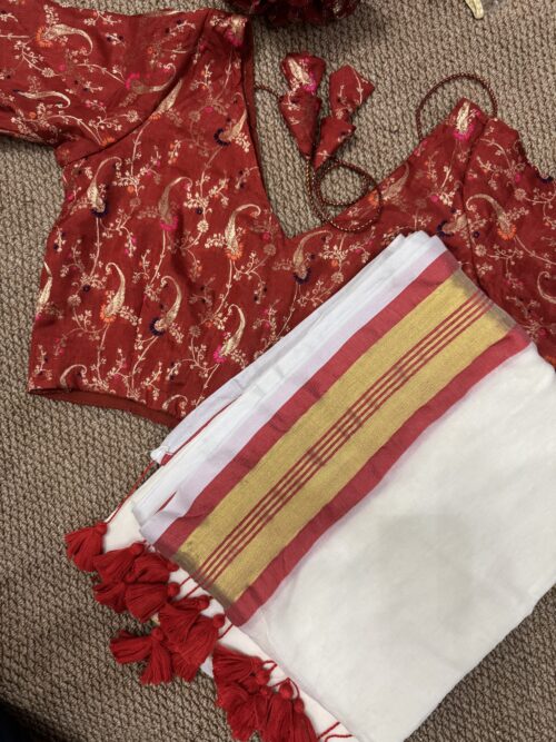 This Onam, Step into grace with our stunning handwoven Mul Mul saree featuring a golden zari border and subtle reddish orange border that adds just the right touch of contrast . Paired with brocade blouse adorned in with multicolour floral print.