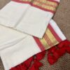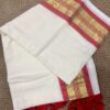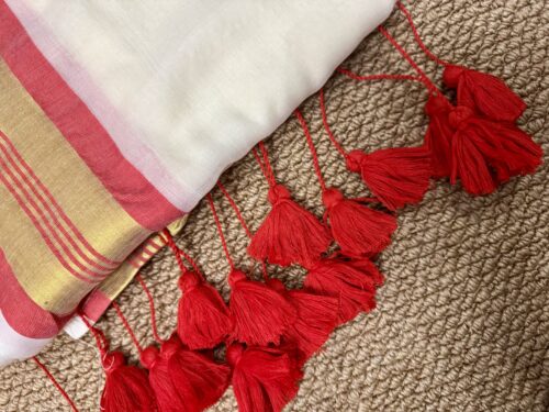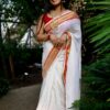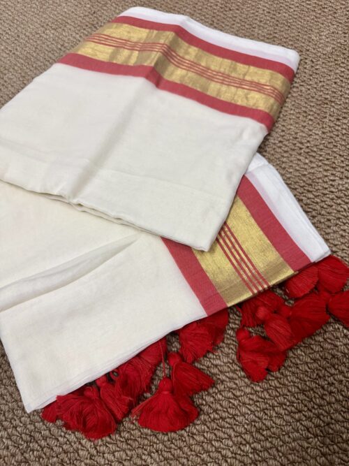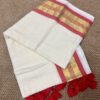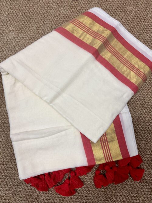 This Onam, Step into grace with our stunning handwoven Mul Mul saree featuring a golden zari border and subtle reddish orange border that adds just the right touch of contrast . No blouse included