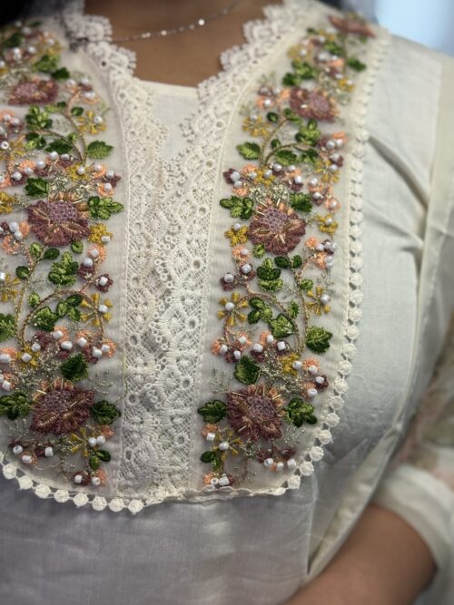 Features intricate flora embroidery neck line .