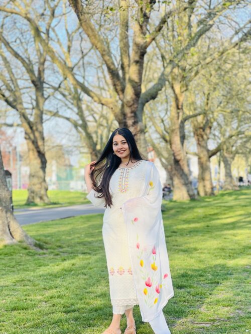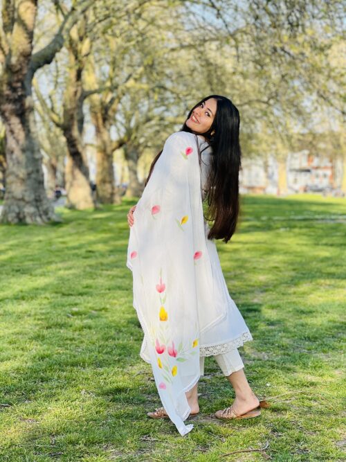 • Dupatta: Hand-painted with vibrant floral designs.