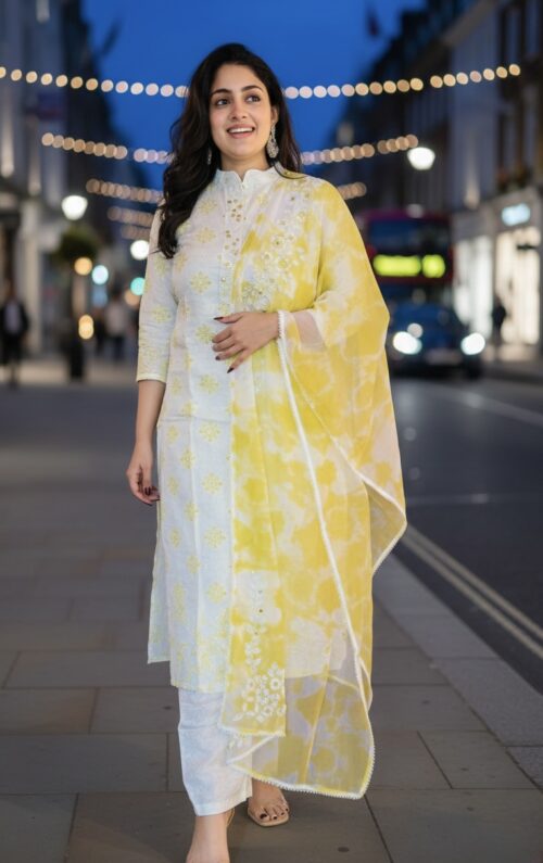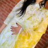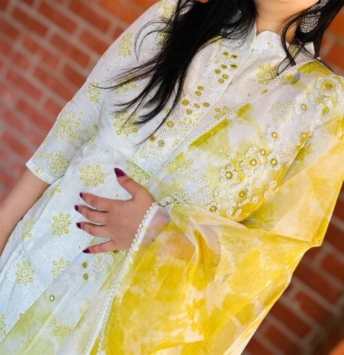 An elegant off-white and pastel Olive green kurta set crafted from premium Dola silk, featuring intricate bead and mirror handwork. Paired with a beautifully embellished organza dupatta for a refined festive look.