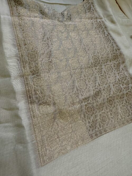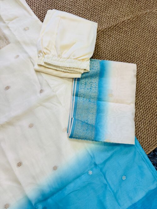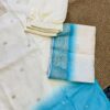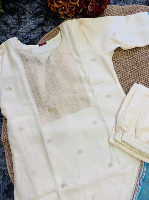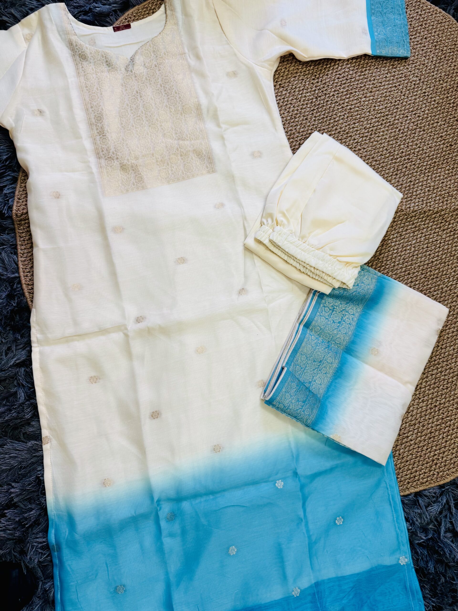 A luxurious 3-piece set featuring a creamy off-white kurta with antique Zari weave at yoke and subtly transitions to a vibrant teal blue ombre at bottom of the kurta. Crafted from premium Dola Silk, this ensemble includes straight-cut trousers and a stunning dupatta finished with an Antique Gold Zari weave along the contrasting teal blue border. Effortless elegance for any special occasion.
