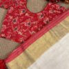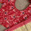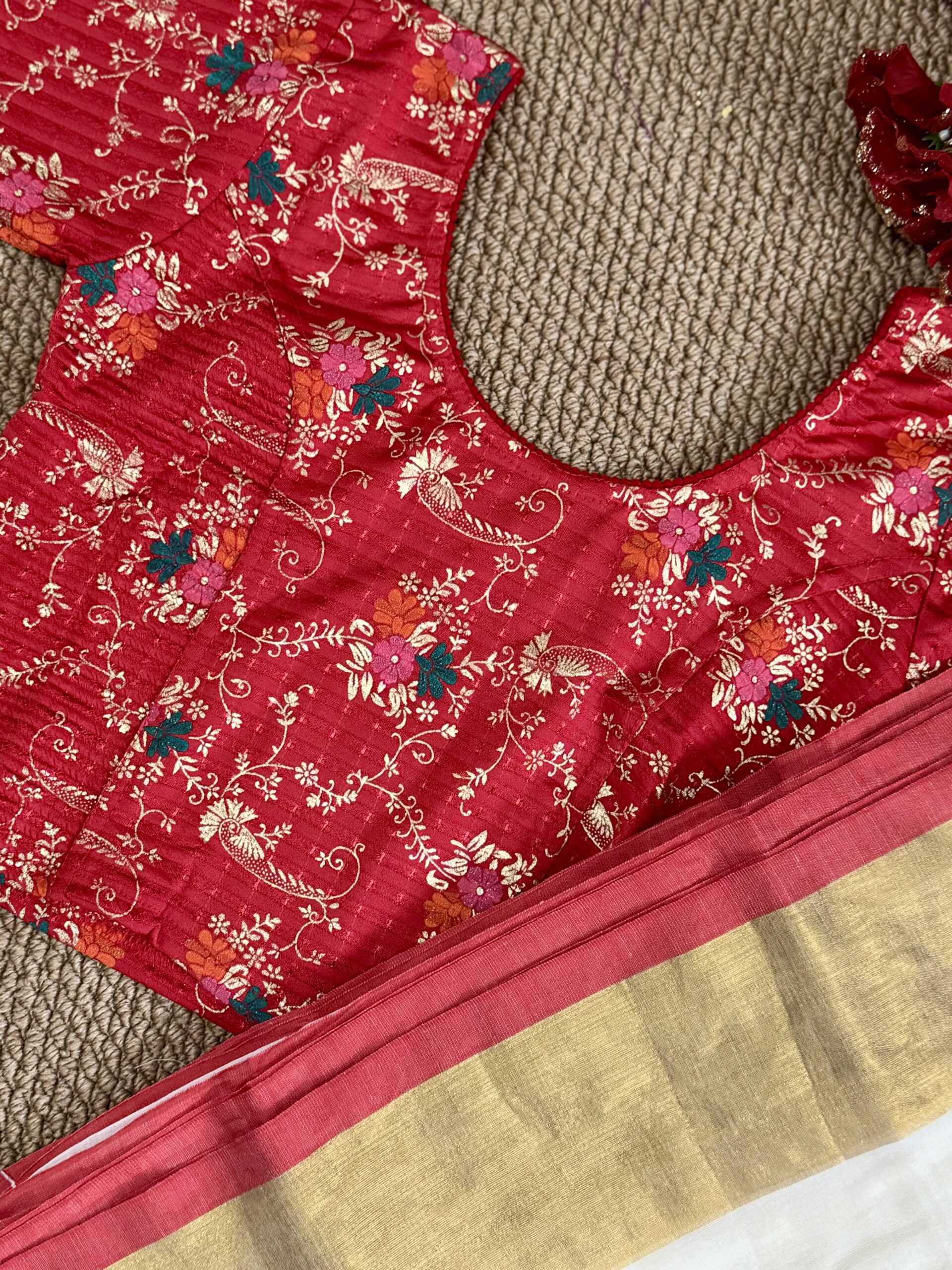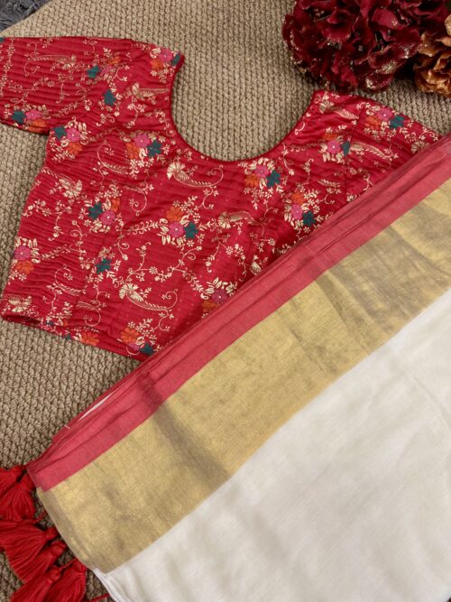 This Onam, Step into grace with our stunning handwoven Mul Mul saree featuring a golden zari border and subtle red border that adds just the right touch of contrast . Paired with Strechable red blouse adorned in with multicolour floral print.