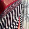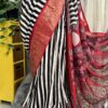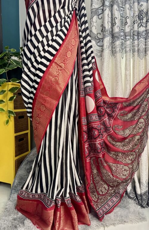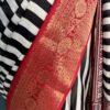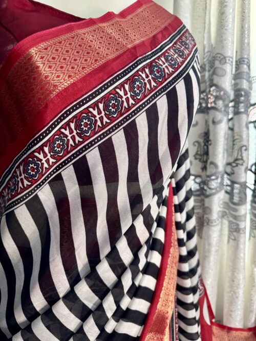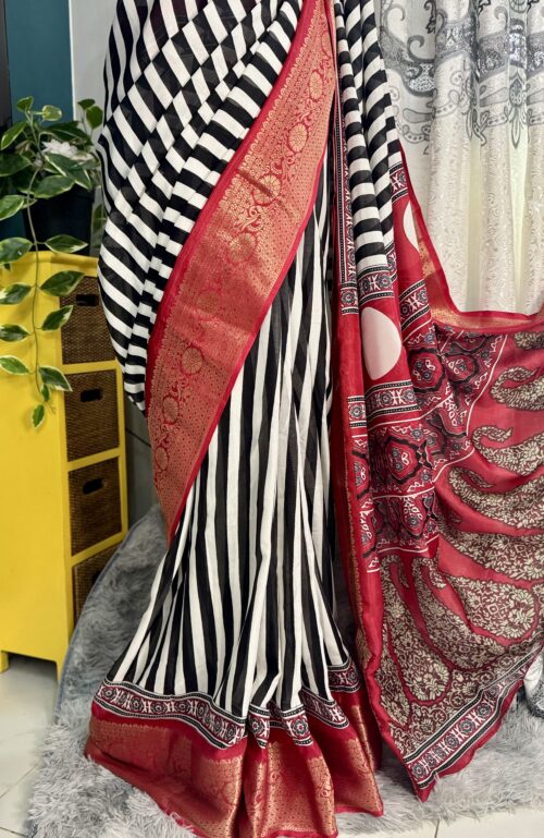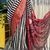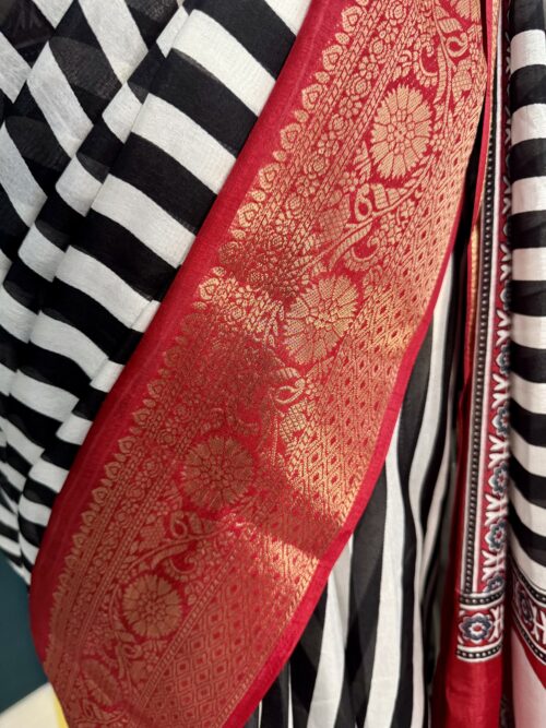 Stunning black & white striped saree featuring a red border and intricate pallu ✨