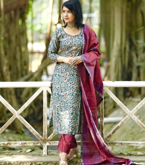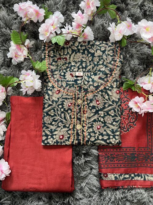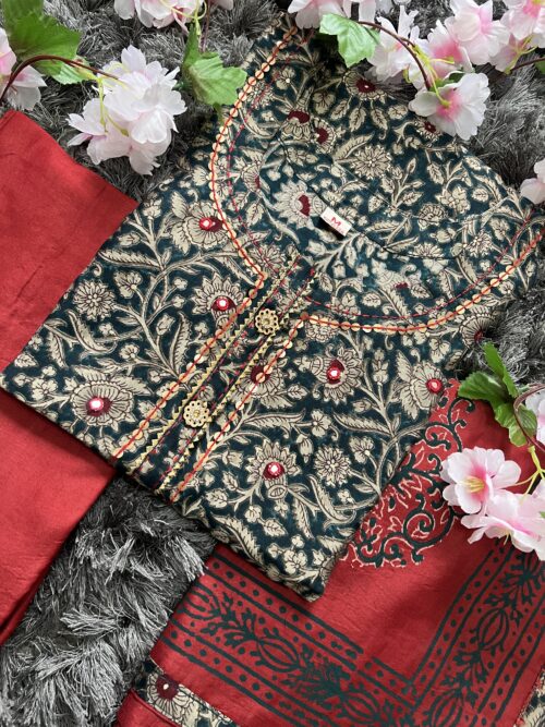 *SILK KALAMKARI PRINT KURTI WITH SOBER WORK OF SEQUENCE AND MIRROR WORK*