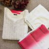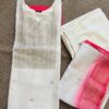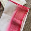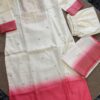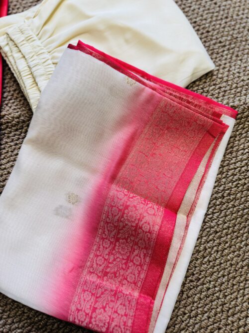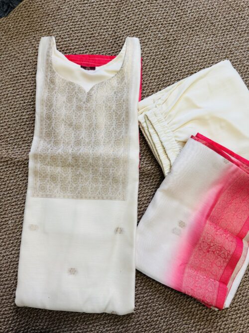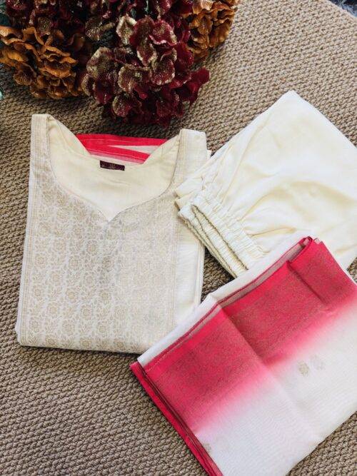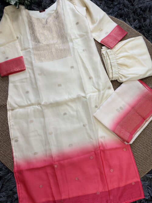 A luxurious 3-piece set featuring a creamy off-white kurta with antique Zari weave at yoke and subtly transitions to a vibrant peach ombre at bottom of the kurta. Crafted from premium Dola Silk, this ensemble includes straight-cut trousers and a stunning dupatta finished with an Antique Gold Zari weave along the contrasting peach border. Effortless elegance for any special occasion.