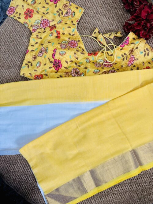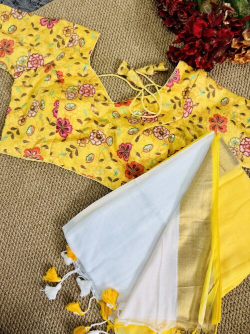 This Onam, Step into grace with our stunning handwoven Mul Mul saree featuring a golden zari border and subtle yellow border that adds just the right touch of contrast . Paired with a stitched yellow Designer blouse adorned in delicate gold and sequence work